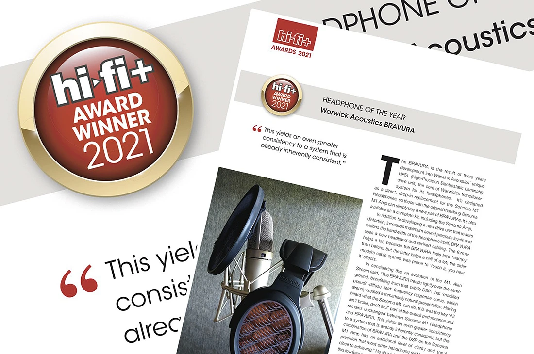 Sluchátka Bravura navazují na ikonický model Sonoma M1, který spatřil světlo světa před pěti lety a byl prvním sluchátkovým systémem na světě, který používal elektroakustický měnič HPEL (High-Precision Electrostatic Laminate), vyvinutý společností Warwick Acoustics (do dnešního dne získal 25 ocenění). U modelu Bravura pak pracovali inženýři společnosti další 3 roky na zdokonalení patentované technologie HPEL měniče, aby ještě zlepšili všechny přednosti, kterými je tento elektrostatický systém pověstný.